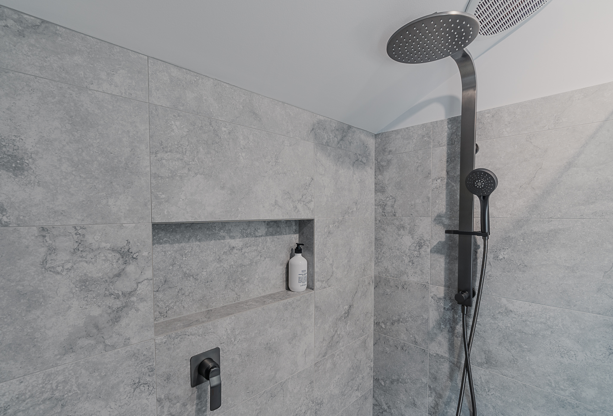 This stylish bathroom renovation perfectly combines modern elegance and functionality. Featuring a bold navy double vanity with shaker-style cabinets, the space is designed to maximise both storage and aesthetic appeal. The sleek porcelain countertop complements the matte black tapware and handles, creating a cohesive and sophisticated look. Large oval mirrors and subtle LED lighting enhance the room's openness and reflect the beautiful textured tiles on the feature wall. With thoughtful design and premium materials, this project showcases the expertise of All City Bathrooms & Kitchens in creating luxurious, timeless spaces for everyday living.